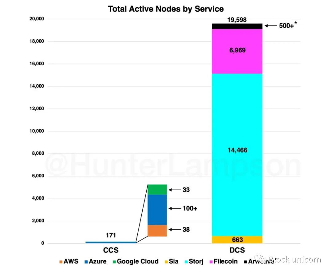 与CCS解决方案相比,DCS解决方案具有革命性的地方在于其去中心化程度。在Sia、Storj、Filecoin和Arweave上运行的活动节点比AWS、Azure和谷歌Cloud管理的数据中心总和多114倍以上。