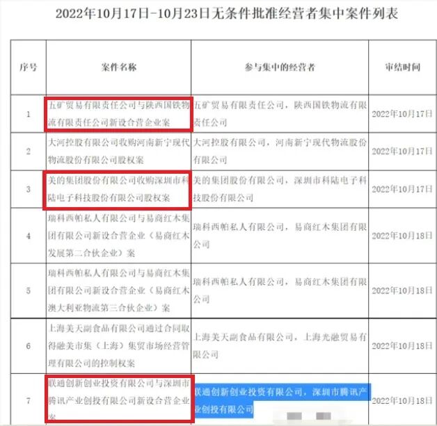 其中,联通创新创业投资有限公司(简称“联通创投”)与深圳市腾讯产业创投有限公司(简称“腾讯产投”)新设合营企业案获无条件批准(第七项)。