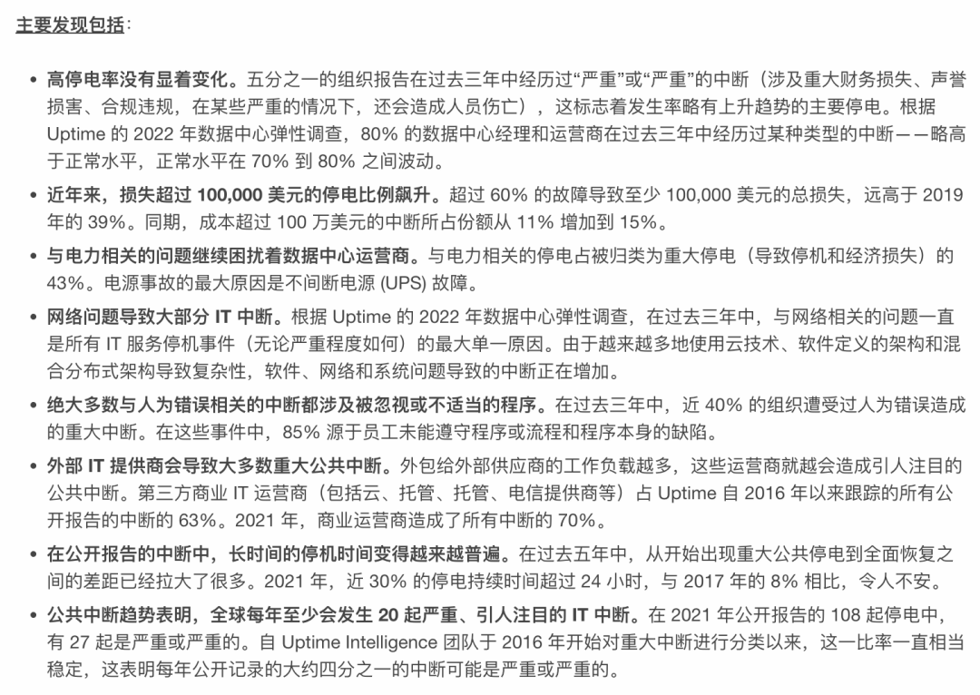 UPTIME INSTITUTE 发布的年度数据中心故障分析报告表明,很多云服务的真实表现低于其发布的 SLA 。对 2022 年故障分析发现:行业遏制故障频率的努力落空,故障成本和后果正在不断恶化【9】。