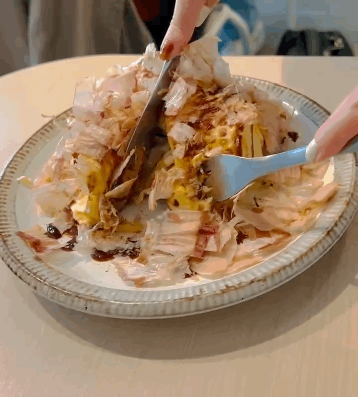 咸口的大阪烧怎么能和甜口舒芙蕾组CP呢?结果一尝,墨妮卡求这对咸甜组合“锁死”!咸香的大阪烧酱汁配上大量“会跳舞”的木鱼花,视觉效果直接拉满!