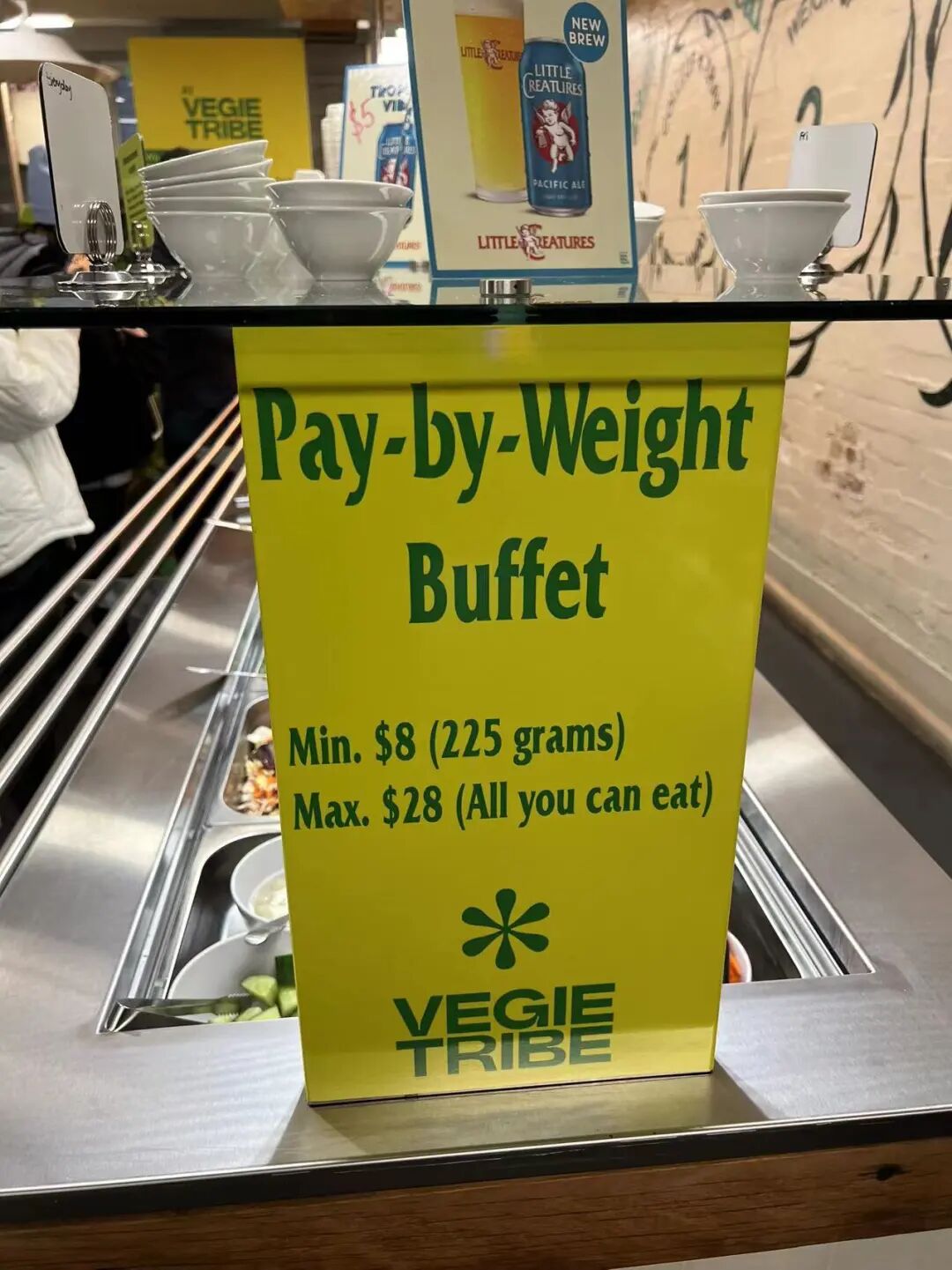 这个自助餐是称重收费的,$1/28g,8刀就能买到4两饭菜了!如果你饭量很大,直接选$28的不限量套餐!