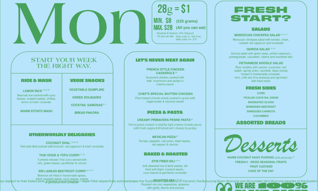 这是Vegie Tribe的每日菜单,挑一天你最喜欢的,去尝一尝全素宴吧!
