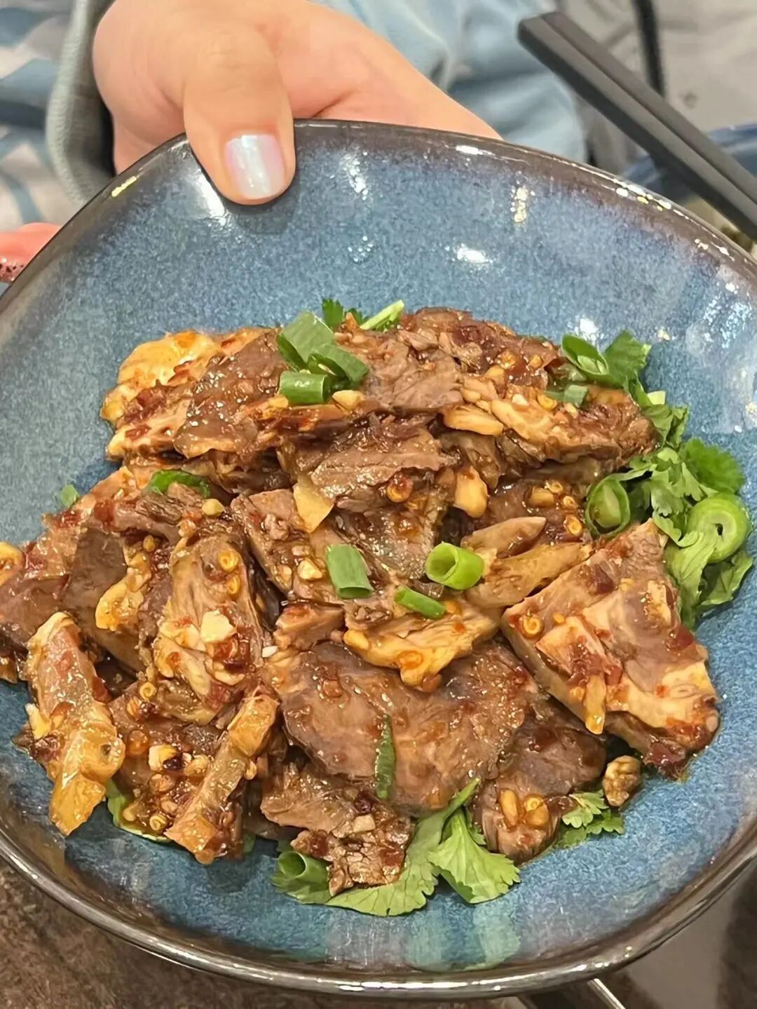 牛肉薄厚均匀,每一块肉上都是满满的红油和辣椒,麻麻辣辣,越吃越上瘾!