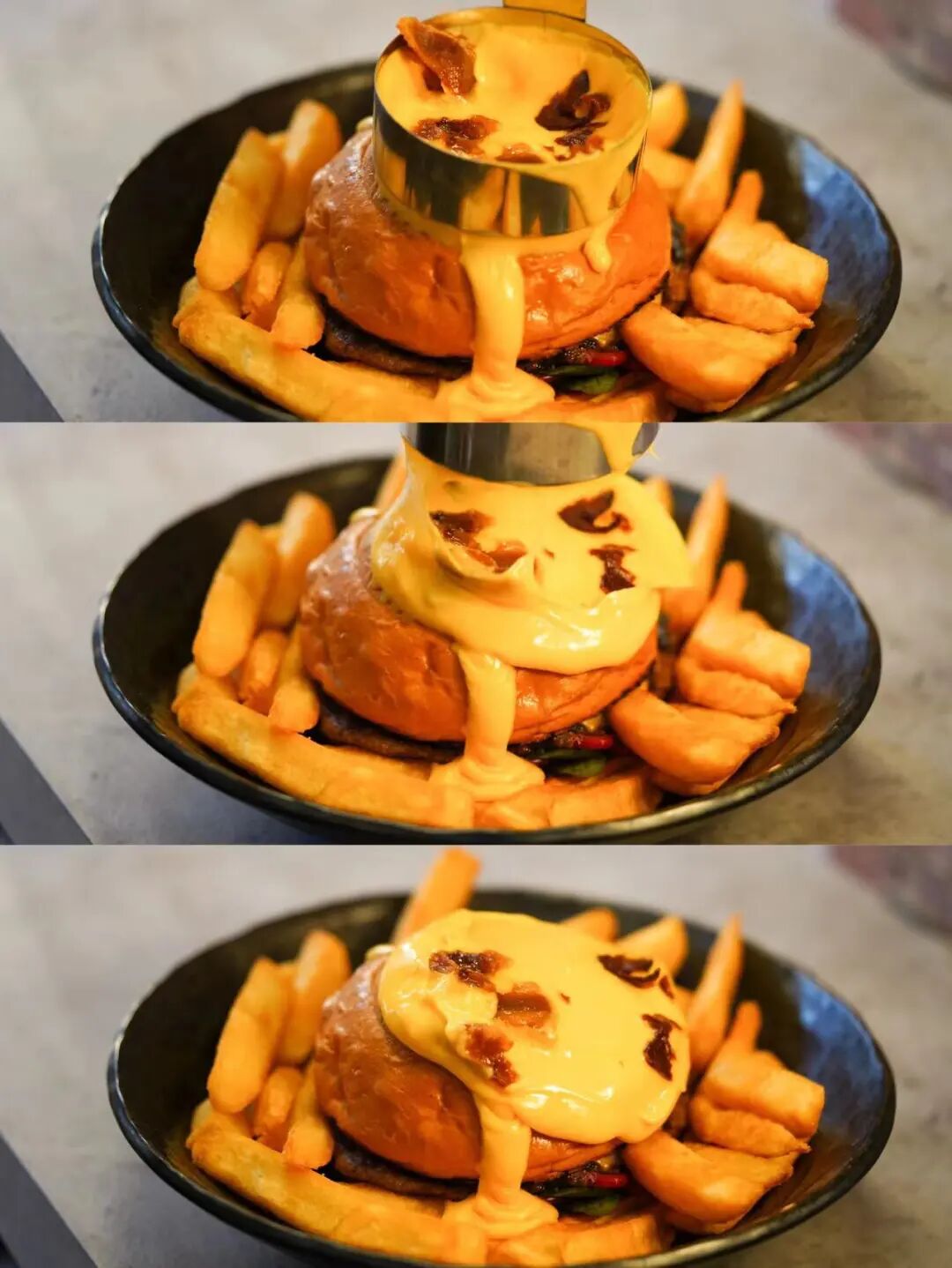 “芝士瀑布”混合酥香的培根脆片,随着芝士倾斜而下的时候,墨妮卡已经忍不住要大咬一口了!用芝士蘸薯条,也是绝配~