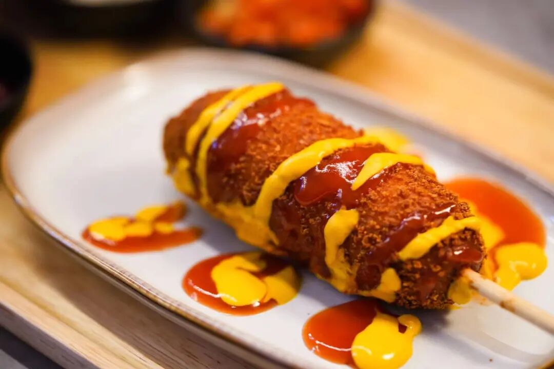 这份首尔拌饭套餐中,还包含三份韩式泡菜和一根芝士香肠热狗,炸制金黄酥脆的热狗裹上黄芥末和番茄酱,这一份碳水爆炸餐,你爱了吗!