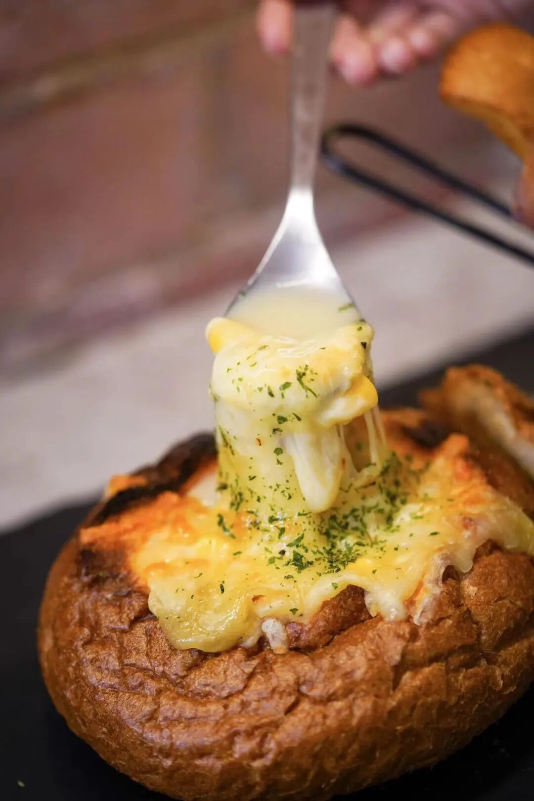 阴雨连绵的天气,当然要有一份香甜的芝士玉米汤!打开面包盖子就是一层厚厚的拉丝芝士,一勺奶白的玉米汤太治愈了。