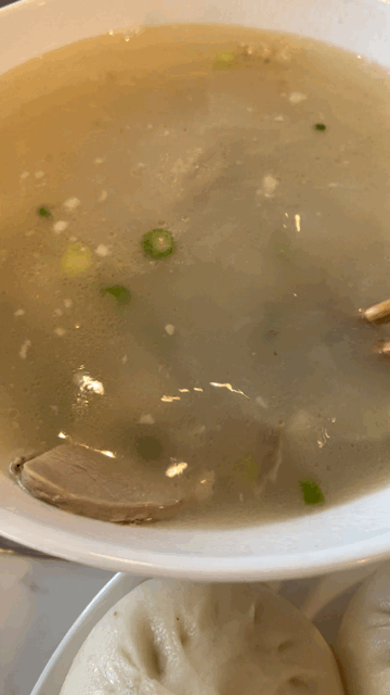 比墨妮卡的脸还大的羊肉汤碗,份量好实在,两个人分吃一碗正合适。切成薄片的羊肉,配上熬好的高汤,喝起来很鲜,没有明显的膻味。墨妮卡很喜欢羊肉汤里淡淡的胡椒粉味道,非常提味!