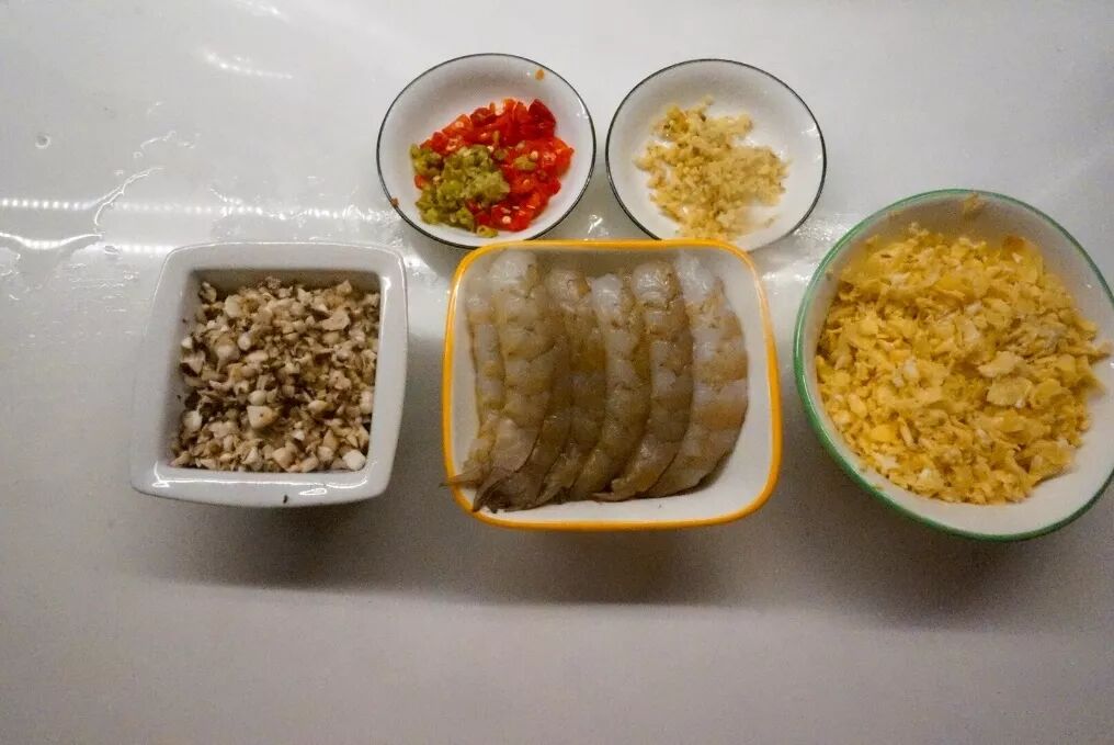 猪肉 虾仁 香菇 鸡蛋碎 葱姜末 小辣椒 盐 生抽 耗油 香油 花椒油