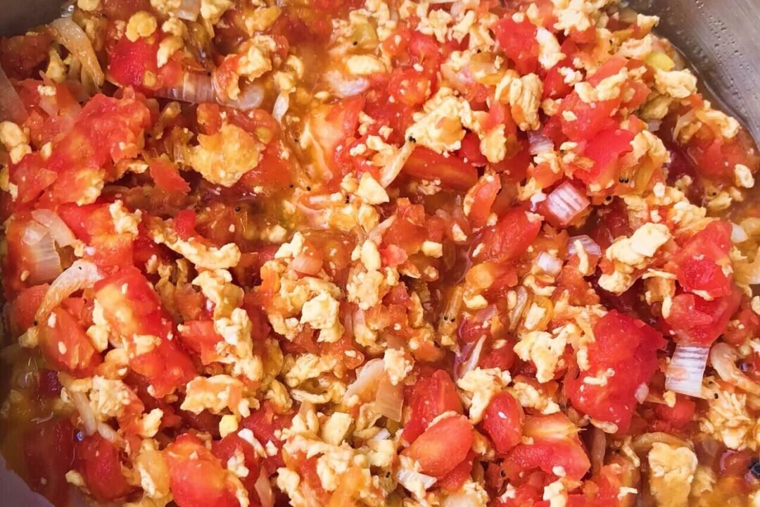 炒好的鸡蛋加入西红柿碎搅拌均匀