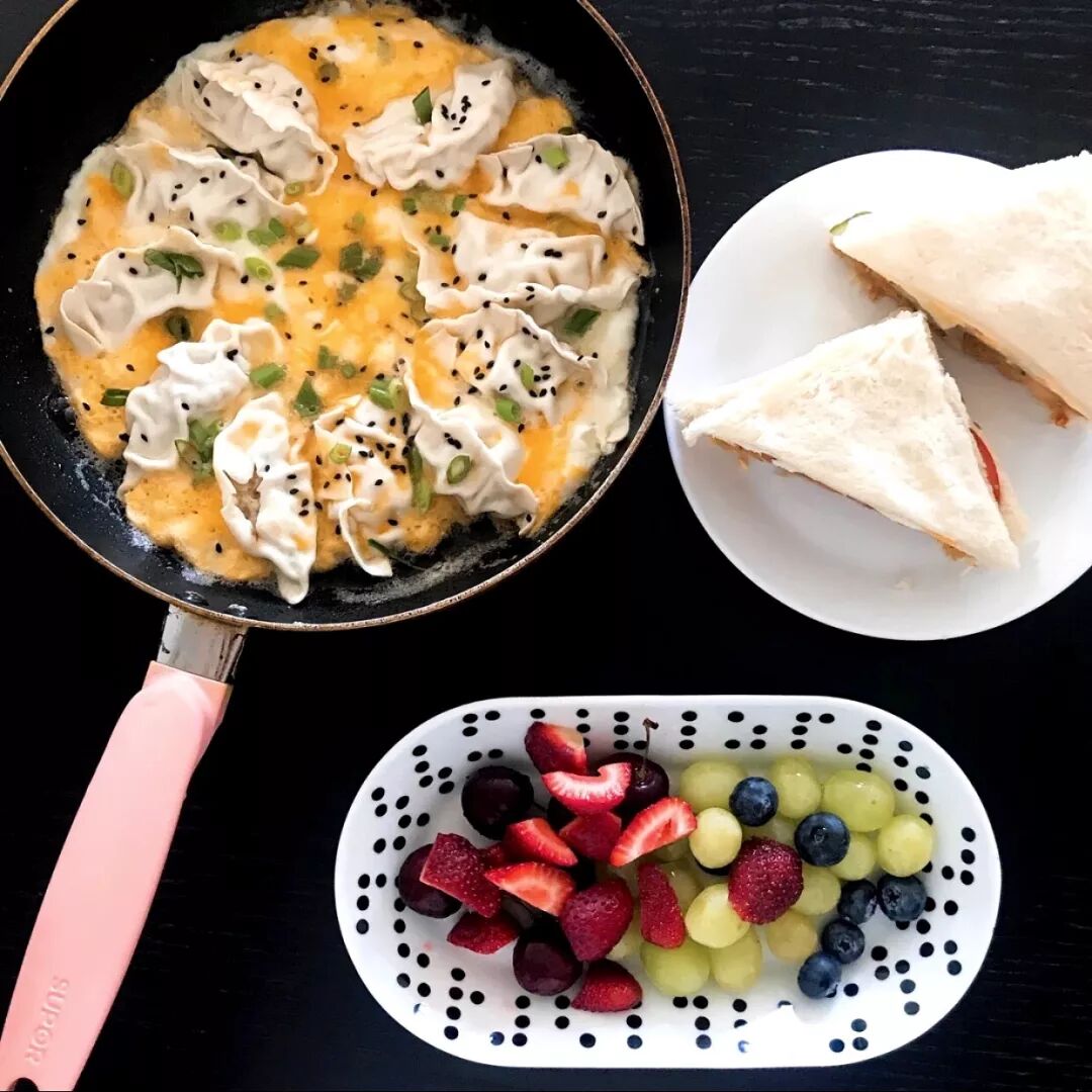 早餐的话,就会把前一天吃剩下的饺子放入冷冻。第二天拿出来依次排好在锅中,和生煎一样的步骤