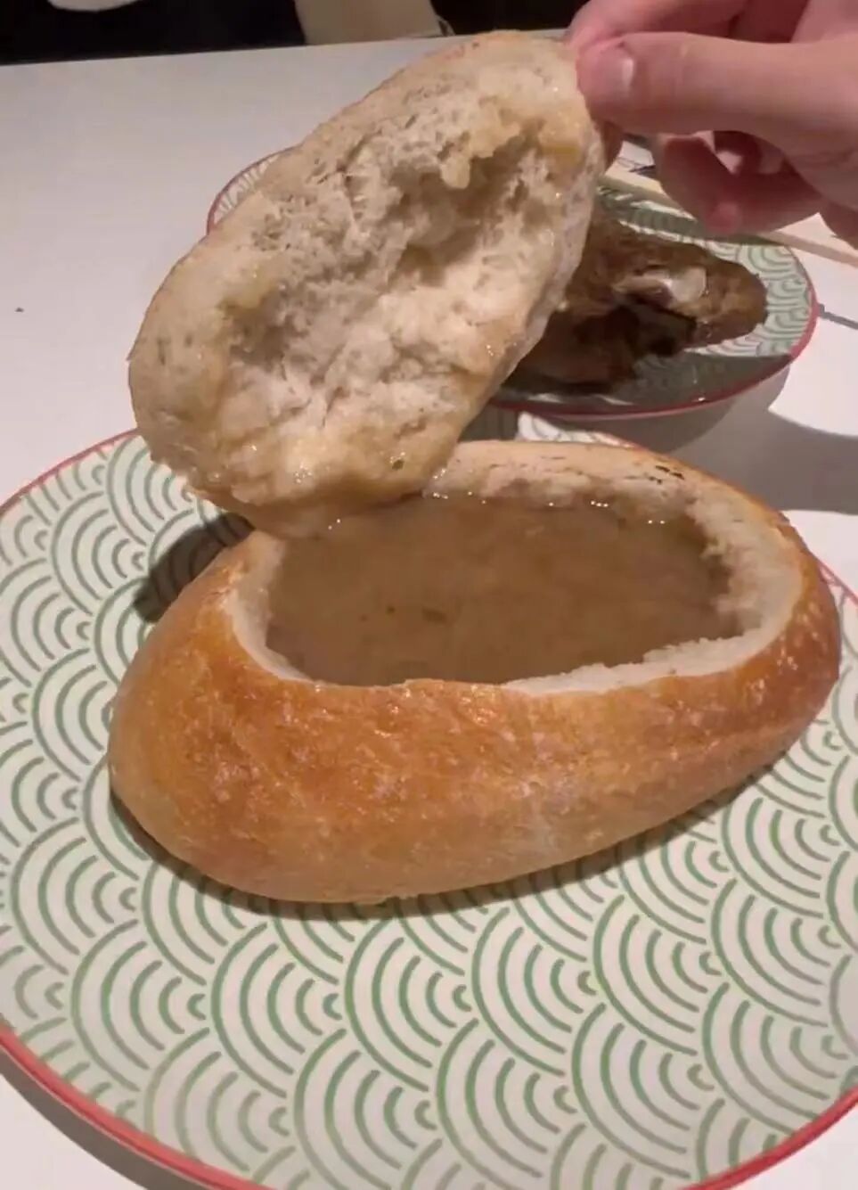 或者像墨妮卡这样,在超市顺便买个大面包,把中间挖空再倒入热好的汤,在家DIY面包浓汤~