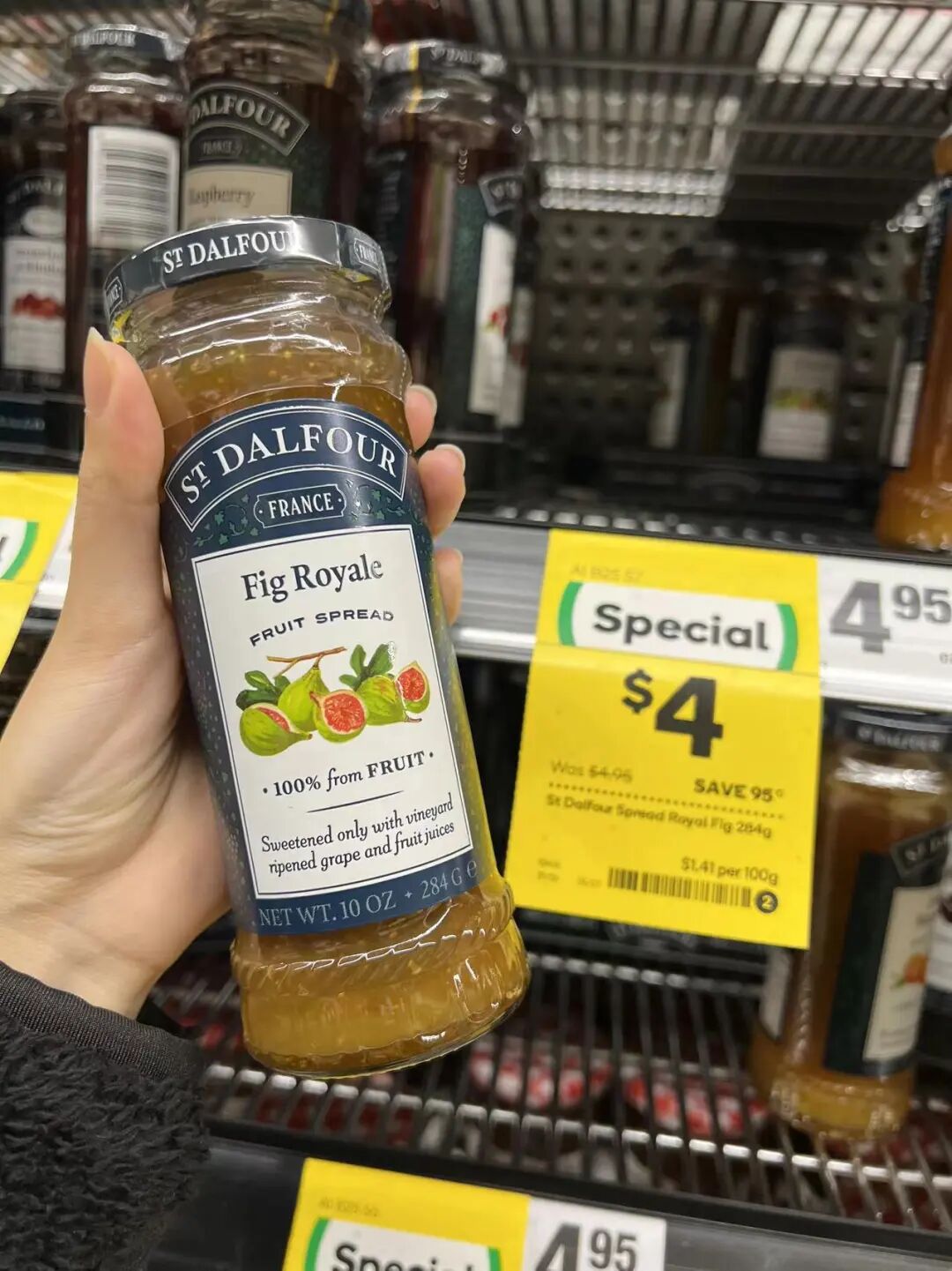 无花果果肉透过瓶子就清晰可见了。这周Woolworths正在打折,ST DALFOUR品牌的所有果酱原价$4.95,现在只要4刀就能买回家,大家快冲!