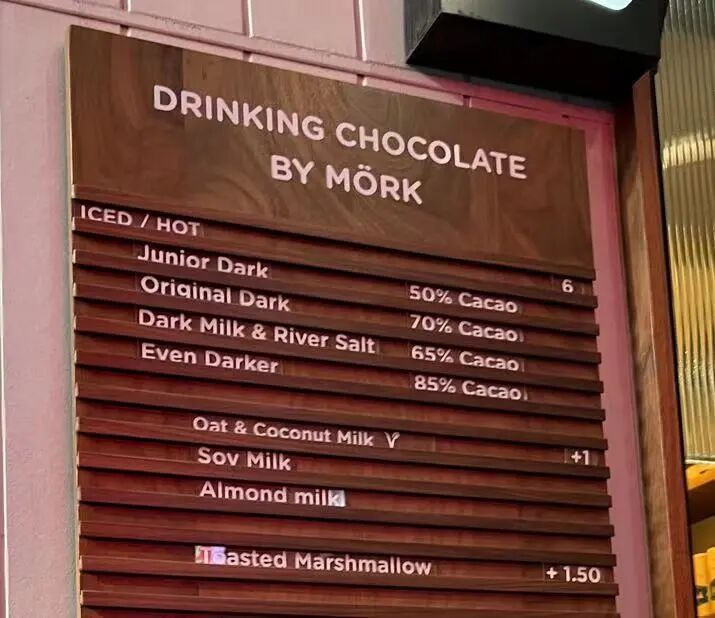 普通的【热巧克力】饮品也很好喝。Mörk Chocolate的四种热巧克力根据可可浓度来划分(50%Cacao、65%Cacao、70%Cacao、85%Cacao),售价为6刀/杯。