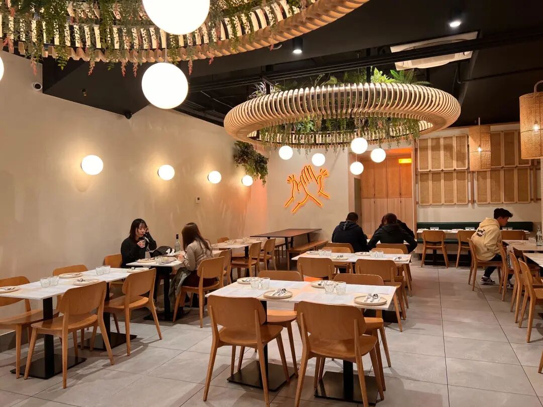 一进店,暖黄的灯光,白色搭配木制的简约现代风设计,餐厅顶上还摆放了些绿植做点缀,在这样一家宽敞明亮的环境下就餐,显得格外亲切~
