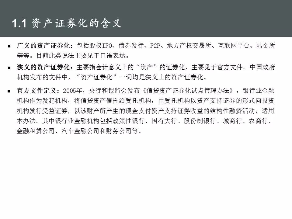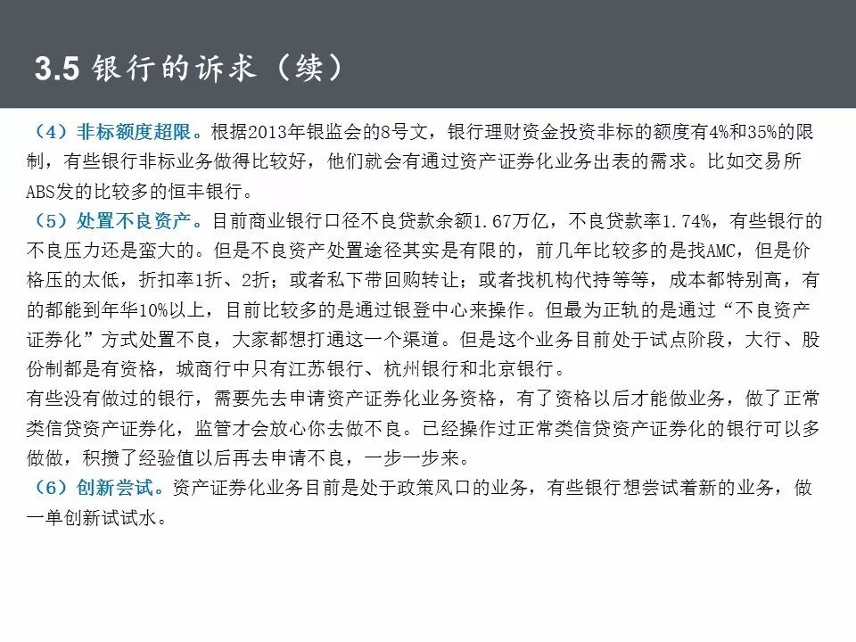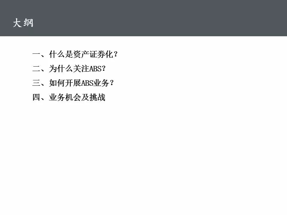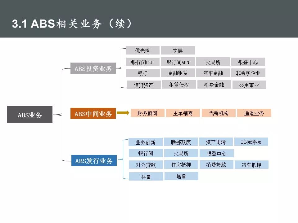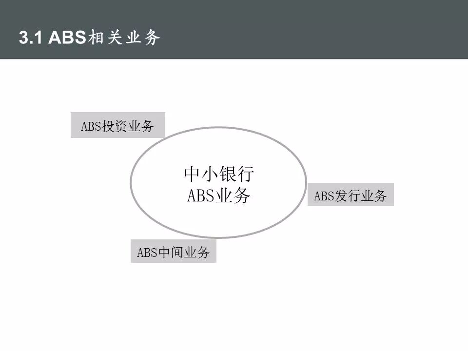 目前,中小银行围绕ABS可以开展的业务主要包括三大方面:ABS投资业务、ABS发行业务和ABS中间业务,具体内容可以参考PPT。最近市场不太好,也快过年了,大家如果有时间,可以约着定点交流一下ABS业务哈。