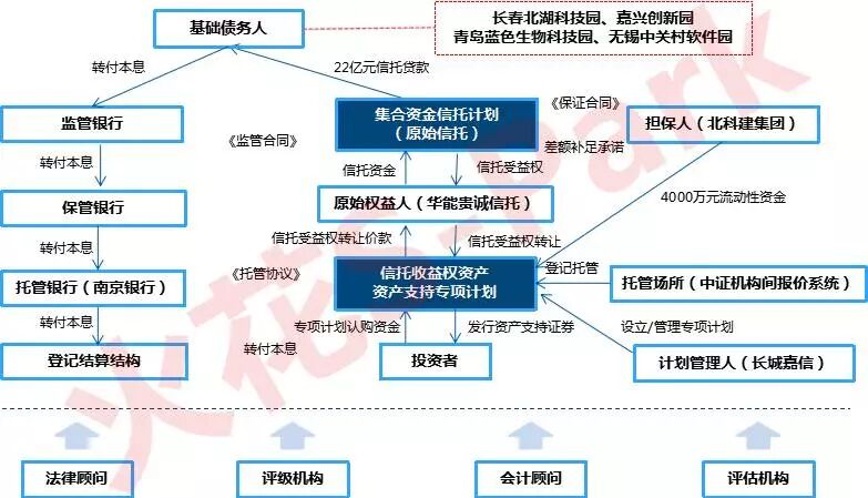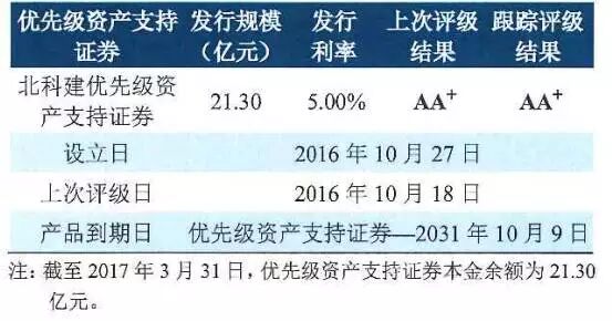 北科建集团在2016年10月27日,于中证机构间报价系统发行挂牌交易的“北科建·创新信托受益权资产支持专项计划”。它是通过华能贵诚信托有限公司以嘉兴、无锡、青岛、长春四家科技地产园区持有物业发行的信托受益权为基础资产,以四家园区持有物业未来租金收入提供现金流支持,并由长城嘉信资产担纲计划管理,成功募集资金22亿元,期限15年,获得AA+评级。