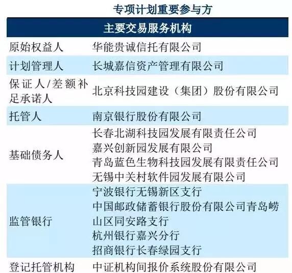 长城嘉信根据其与原始权益人华能贵诚信托有限公司(下称“华能信托”)及其作为受托人设立的“华能信托•安溢现金管理集合资金信托计划”共同签订的《北科建•创新信托受益权资产支持专项计划信托受益权转让协议》,以投资人的认购资金22亿元向原始权益人购买其享有的“华能信托·北科建科技园项目贷款集合资金信托计划”的信托受益权。