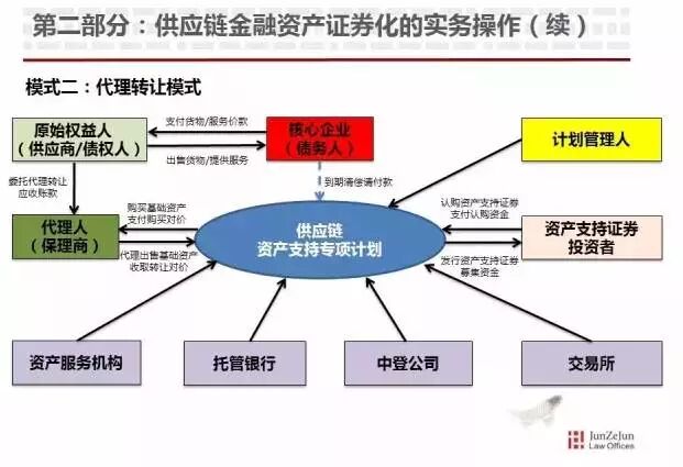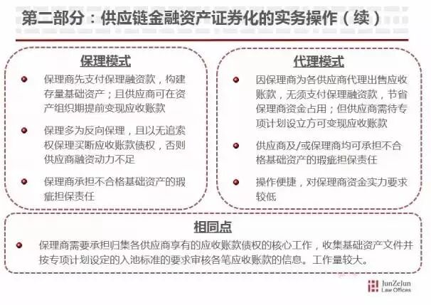 代理模式。因保理商为各供应商代理出售应收账款,无须支付保理融资款,节省保理商资金占用;但供应商需待专项计划设立方可变现应收账款。供应商及/或保理商可承担不合格基础资产的瑕疵担保责任。操作便捷,对保理商资金实力要求较低。