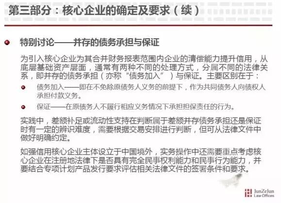 特别讨论。并存的债务承担与保证。为引入核心企业为其合并财务报表范围内企业的清偿能力提供信用,从底层基础资产层面,通常有两种不同的处理方式,分属不同的法律关系,即并存的债务承担(亦称“债务加入”)与保证。主要区别在于:(1)债务加入,即在不免除原债务人义务的前提下,作为共同债务人向债权人承担付款义务。(2)保证,在原债务人不履行相应义务情况下承担责任的行为。