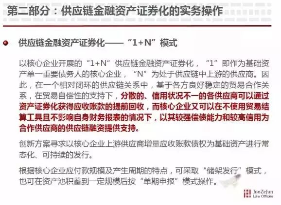 以核心企业开展“1+N”供应链金融资产证券化,“1”即作为基础资产单一重要债务人的核心企业,“N”为处于供应链中上游的供应商。因此,在一个相对闭环的供应链关系中,基于各方良好稳定的毛衣合作关系,在贸易自偿性的支持下,分散的、信用状况不一的各供应商可以通过资产证券化获得应收账款的提前回收,而核心企业又可以在不使用贸易结算工具且不影响自身财务报表的情况下,以其较强偿债能力和较高信用为合作供应商的供应链融资提供支持。