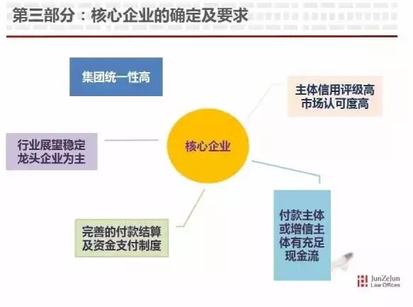 核心企业。行业展望稳定,龙头企业为主;主体信用评级高,市场认可度高;集团统一性高;付款主体或增信主体有充足现金流;完善的付款结算及资金支付制度。