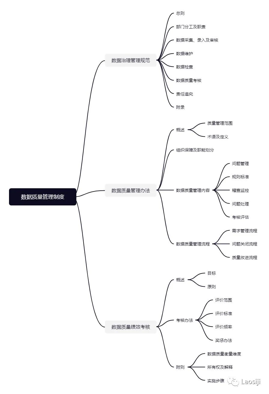 规范 是按照规范制度的要求提出具体可落地、可执行的实施措施。所以一定是很具体可量化的细则。例如:我们在规范中可以强调数据的及时性,但是在具体的管理办法中需要明确、量化及时性这一指标概念。如:获取数据后X个工作日内录入数据,发生变更时X个工作日内完成数据更新等。细分来讲,数据质量管理制度应该由以下几个关键部分组成:
