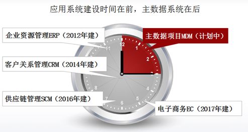 主数据系统是一个企业级的系统。如果企业在总体IT系统建设时,就已经考虑主数据系统的建设,对企业各系统进行统一规划、接口设计,应将主数据系统建设在前、业务系统建设在后,那么主数据系统的构建,会顺畅很多。但现实的情形是,多数企业都是在各类业务系统(如HR、ERP、MES、CRM等)已经构建运营多年,企业的信息化发展提升遇到瓶颈时,才开始重视主数据,考虑建设主数据管理系统。由于主数据系统建设前,业务系统间数据都是以点对点的模式交互,导致主数据在各个系统间各自为政,信息孤立,这时建设主数据系统企业会发现,主数据系统正在挑战他们现有的IT架构:他们拥有太多的独立平台处理主数据。各种业务系统的主数据梳理、系统改造,影响面会非常广,业务风险点非常多,各个部门、各个系统、各类人员都需要协调推进,有可能会成为物料主数据项目不可承受之重。这是主数据系统建设推进困难的关键。
