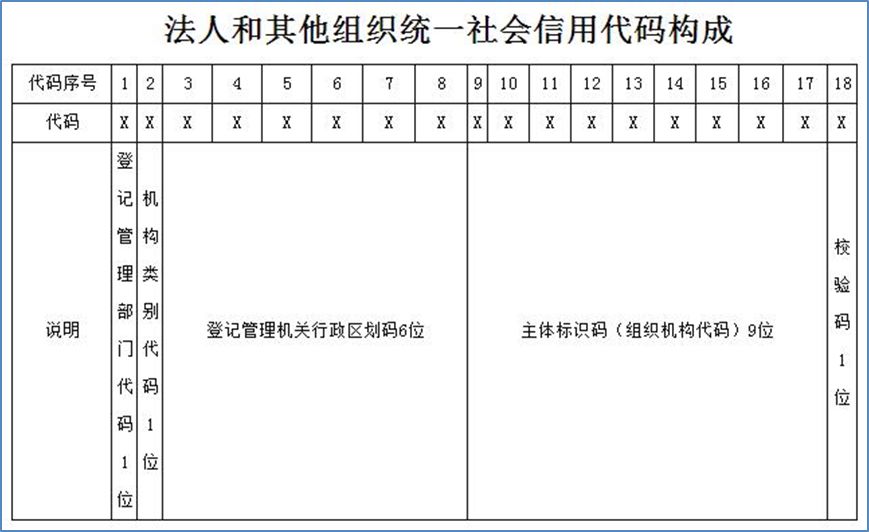 《法人和其他组织统一社会信用代码编码规则》标准规定统一社会信用代码用18位阿拉伯数字或大写英文字母表示,代码结构为1位登记管理部门代码+1位机构类别代码+6位登记管理机关行政区划码+9位主体标识码(组织机构代码)+1位校验码,如下图所示。