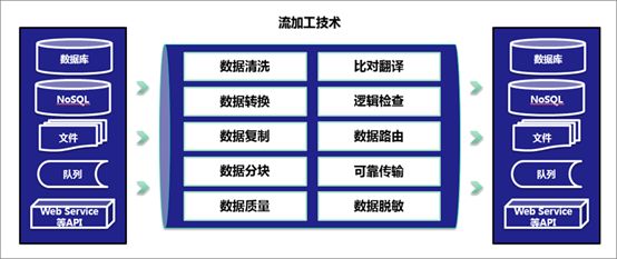 数据加工基于流加工技术实现。流加工技术是指在一个数据服务流内实现数据检查、数据清洗、数据比对、数据转换、数据逻辑判断、数据路由、数据异常处理等计算并将计算的结果输出到数据服务的目标中;流加工技术通过优化算法,将数据服务的加工计算在数据管理引擎内一次完成,减轻数据源和目标IO操作和计算压力,大大降低了对数据源和数据目标的影响。