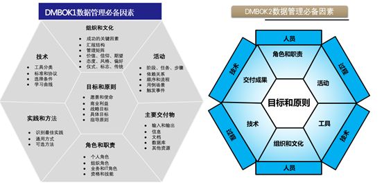 六边形内容变化“实战和方法”,“主要交付物”两部分内容 合并为交付管理,增设工具内容。DMBOK1以理论知识体系为主,在“实战和方法” “主要交付物”两部分,强调的是方法论,而DMBOK2强调交付和工具的重要性;