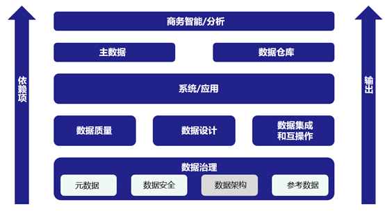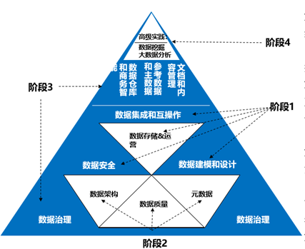 第3阶段:管理数据质量、元数据和架构需要严格地实践数据治理,为数据管理活动提供体系性支持。数据治理还支持战略计划的实施,如文档和内容管理、参考数据管理、主数据管理、数据仓库和商务智能,这些黄金金字塔中的高级应用都会得到充分地支持。
