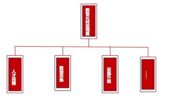 企业数字化转型需要准确制定财务预算。数字化转型期间 涉及的人才招聘、设施升级、数据采集等环节均离不开财务的支持,如下图所示。企业应基于数字化转型前期的调研和认知, 预估转型过程中所需的费用,才能在实践过程中做到游刃有余, 不至于产生费用乱拨的情况。企业需要估算数字化转型所需要的 时间和费用,确定财务成本和时间成本,从而做到有的放矢。