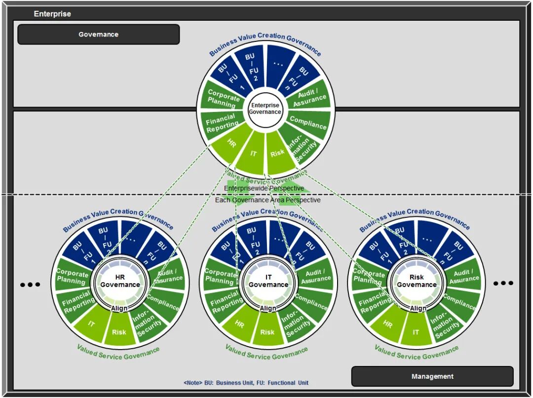 IT治理是公司治理的一部分。下图可见公司治理涉及到公司的方方面面,人力资源管理、IT治理、风险管理等都是公司治理的一部分。所以IT治理的范围不只是治理IT部门,涉及到公司决策层、管理层和各个部门,是公司级关注事项。提升IT治理能力能够有效提升公司治理能力。