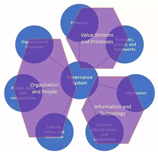 这七项治理对象又可以分为三类:组织和人员,价值流和流程,信息和技术。