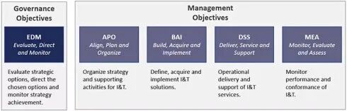 主要是通过对所有IT资源进行规划和组织、获取和实施、交付和支持、监控等活动,实现业务目标,达成治理目标。