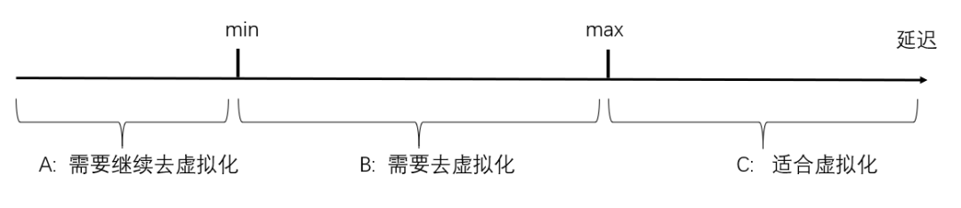 如果上层某一个应用需要保证的最低延迟仍大于max,那么这层虚拟化对这个应用就没有损害,可以大胆的引入这个虚拟化技术(也就是上图的C区域)。
