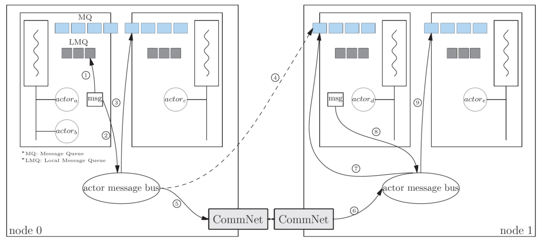 如上图的箭头2和箭头3所示,同一机器上不同线程上的actor之间发送消息,需要通过actor message bus路由,譬如actor_a和actor_c之间的消息。