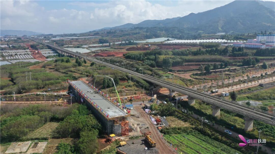 此次完成连续梁混凝土浇筑的嵩明蔡家村3号大桥,位于云南省昆明市嵩明县境内,主跨连续梁为三跨,与沪昆高铁平行、上跨乡村公路。