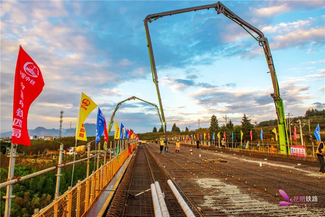 昆明铁路消息:10月25日上午,我国八纵八横铁路网之一的渝昆高铁建设取得突破,云南境内首座大桥连续梁完成混凝土浇筑施工,标志着渝昆高铁云南段桥梁建设由下部工程向上部工程迈进。