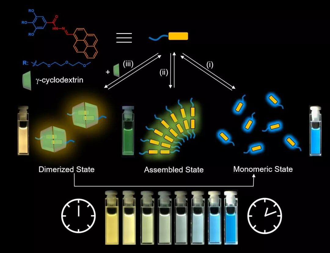 本工作中,研究者们通过将荧光团芘以酰腙的方式连接在亲水性分子上,构建含单一荧光团的两亲性分子,该分子的发光波长与荧光团芘之间的距离密切相关。研究者们通过亲疏水作用力以及主客体识别作用这两种超分子手段来实现可逆调控荧光团芘之间的距离,进而实现对其荧光颜色的可逆调控,在很大范围内能够调节其发光颜色从蓝到黄并包含白光发射。同时,研究者利用α-淀粉酶缓慢催化降解环糊精大环的机制,实现了超分子组装体在酶催化条件下发生自发解离过程,进而构建出以环糊精为化学燃料,时间“编程”的非平衡动态组装荧光系统,并成功应用于自擦除的凝胶书写材料。