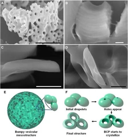 通过对多圆环结构形成过程的动力学研究,证明此自组装体的形成遵循独特的途径,并且PFS嵌段的结晶过程在此过程种起着决定性作用。图2为3D多圆环结构形成机理的示意图。首先,嵌段聚合物会自组装成微米级的囊泡结构,在没有晶种的条件下,得到无定形膜。但在PFS55-b-PI500晶种存在时,PFS-b-PS的自组装被限制在囊泡内,最终得到环形的结构。同时,在此混合溶剂中加入第三种溶剂,此介孔组装体的形态也会发生变化,可得到球形度更高的介孔结构,或者形成多环薄膜等。
