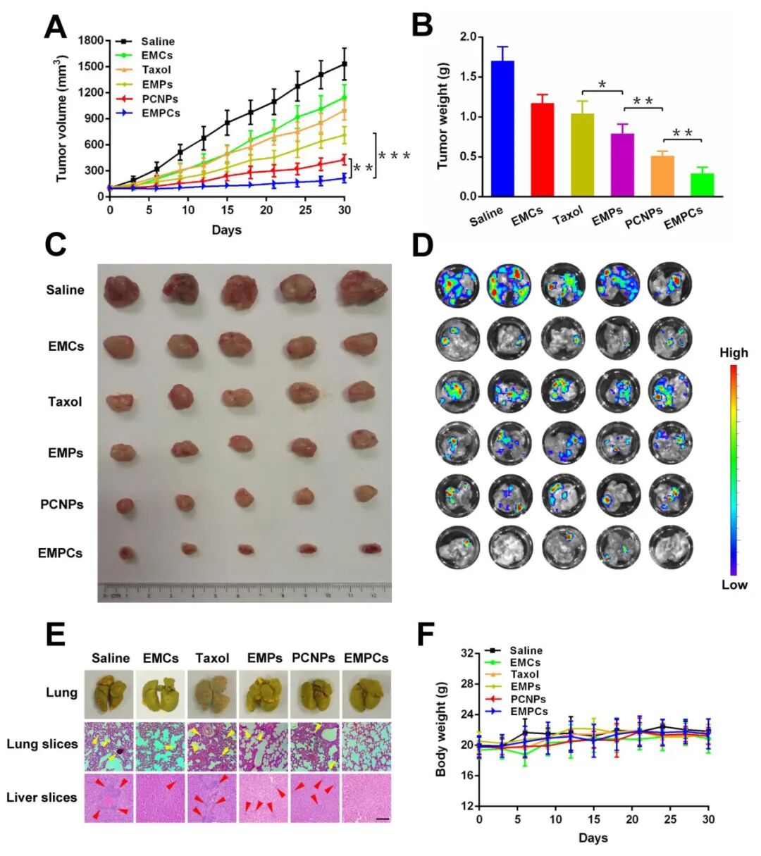 图2:(A)用各种制剂治疗的原位MDA-MB-231-luc荷瘤小鼠的肿瘤生长曲线。(B)各组原位MDA-MB-231-luc荷瘤小鼠的肿瘤重量。(C)治疗后解剖出的肿瘤图像。(D)不同制剂治疗后剖出的肺的离体生物发光图像。(E)治疗结束后肺部的Bouin's固定液染色图片以及肺部和肝脏的H&E切片染色结果。红色圆圈显示可见的转移部位,黄色和红色箭头分别指出了肿瘤的肺部和肝脏转移。(F)治疗过程中小鼠的体重变化情况。在此,我们将ROS敏感的单硫醚键连接的紫杉醇-亚油酸前药(PTX-S-LA)和葫芦素B共同封装到PEG-PCL聚合物中制得双载药胶束,并进一步用肿瘤细胞衍生的外泌体膜修饰,制备外泌体样序贯活化仿生前药纳米平台。该制剂不仅有效地靶向原发肿瘤,而且特异性捕获清除CTCs,从而显著抑制了肿瘤转移。细胞摄取后,纳米粒将首先释放出葫芦素B,从而通过FAK / MMP信号通路调节显著阻断癌细胞的粘附,迁移和侵袭并抑制肿瘤转移。同时,释放的葫芦素B增加了肿瘤细胞中的ROS水平,级联促进了PTX-S-LA前药的活化,起到一石二鸟的作用。该制剂表现出了出色的CTCs靶向能力、增强的前药活化、延长的体内循环时间、更多的肿瘤蓄积和更深的瘤内渗透,在原位和异位MDA-MB-231肿瘤模型中均表现出出色的原发性肿瘤抑制和抗转移活性。本文将肿瘤衍生外泌体膜介导的CTCs清除和序贯释药、级联增强的前药生物活化整合到独特的仿生纳米平台中,作为有临床转化前景的二合一纳米治疗平台,为抗乳腺癌转移提供了全新策略。沈阳药科大学无涯创新学院药剂学研究生王开元和叶皓为论文的共同第一作者,沈阳药科大学无涯创新学院孙进教授为论文的通讯作者。沈阳药科大学无涯创新学院孙进教授:孙进教授基于生物药剂学基本原理和制剂新技术进行创新药物和制剂的设计、评价和应用。主要科研成果包括:(1)基于药物转运体设计创新前体药物,提高药物的口服“成药性”;(2)设计“成药性”高的小分子前药自组装纳米制剂。辽宁省“药用辅料和包材工程技术中心”和沈阳市“生物药剂学重点实验室”负责人,入选了国家“万人计划”科技创新领军人才、科技部“中青年科技创新领军人才”和教育部“新世纪优秀人才支持计划”,荣获2018年辽宁省优秀专家等称号。