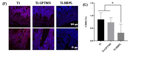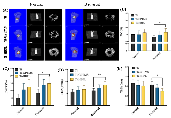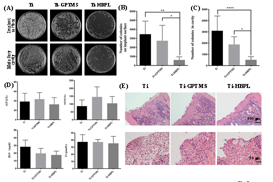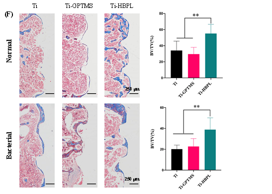 构建金黄色葡萄球菌感染的大鼠骨缺损模型,将表面修饰超支化聚赖氨酸的植入体植入3天后,与对照组相比,种植体表面和髓腔中的细菌数目明显减少,抗菌效果良好。同时,HE染色及CD68染色实验表明,与对照组纯钛相比,表面有超支化聚赖氨酸涂层的种植体能减弱组织的炎症反应。血清中肝肾功能相关指标也未见异常,说明植入体的生物安全性良好。Micro-CT及Masson染色实验表明,Ti-HBPL组的种植体相比于纯钛组能更好地促进新骨的形成,促进种植体与组织之间的整合,并且这种促进作用在感染组中更加明显。