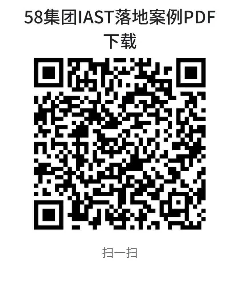 下图是58集团IAST落地全过程的PDF版本资料的申请二维码,记录了他们在内部落地洞态IAST所遇到的一些问题以及最终如何把IAST成功部署上线并推广。