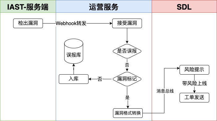 安全团队设计了⼀套漏洞运营流程,将 IAST 检出的漏洞收敛到应⽤安全的漏洞治理体系中。该流程依赖洞态的 Webhook 转发机制,通过运营服务应⽤完成⾃动忽略历史标记为误报的漏洞、安全运营⼈员对漏洞打标和将漏洞同步到SDL平台等流程,具体流程如图 5 所示: