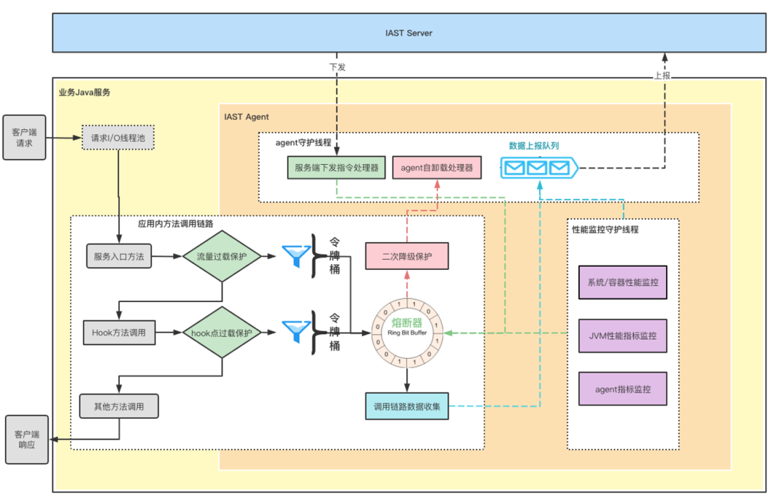 58安全团队计划于测试环境部署洞态 IAST,由于测试服务也具有稳定性要求,安全产品的部署需优先保证业务⽅服务的可⽤性及稳定性。因⽽部署前需要先⾏设计监控降级⽅案,以防部署后对业务造成困扰。