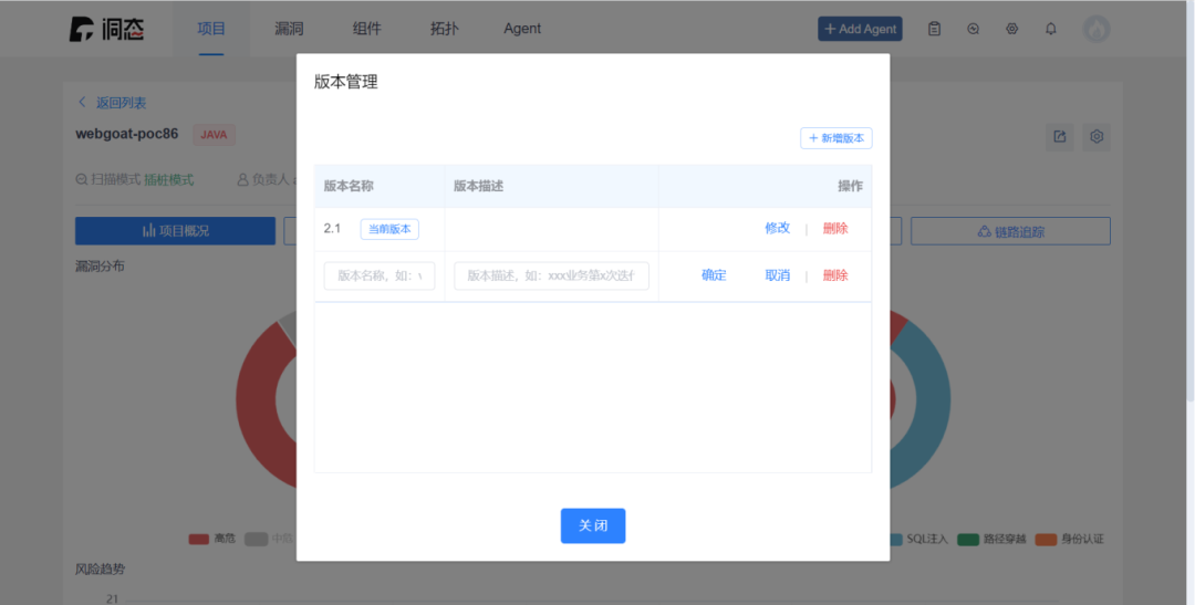 洞态IAST具有版本管理的模块,在内部迭代版本的时候各个版本相互隔离,用于版本迭代或者灰度测试等场景,验收研发漏洞修复的成果。