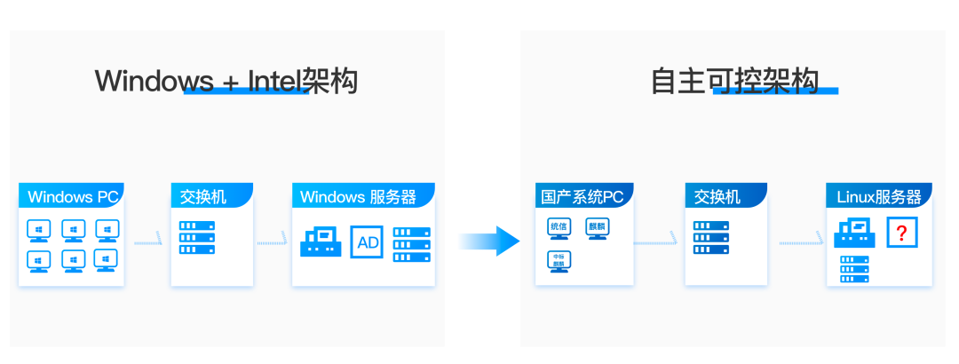 终端和AD替换不是一蹴而就的,既有Windows终端、新购Windows终端、信创终端、微软AD和AD替代方案会有阶段性共存,而在过渡阶段主要面临的是迁移问题:
