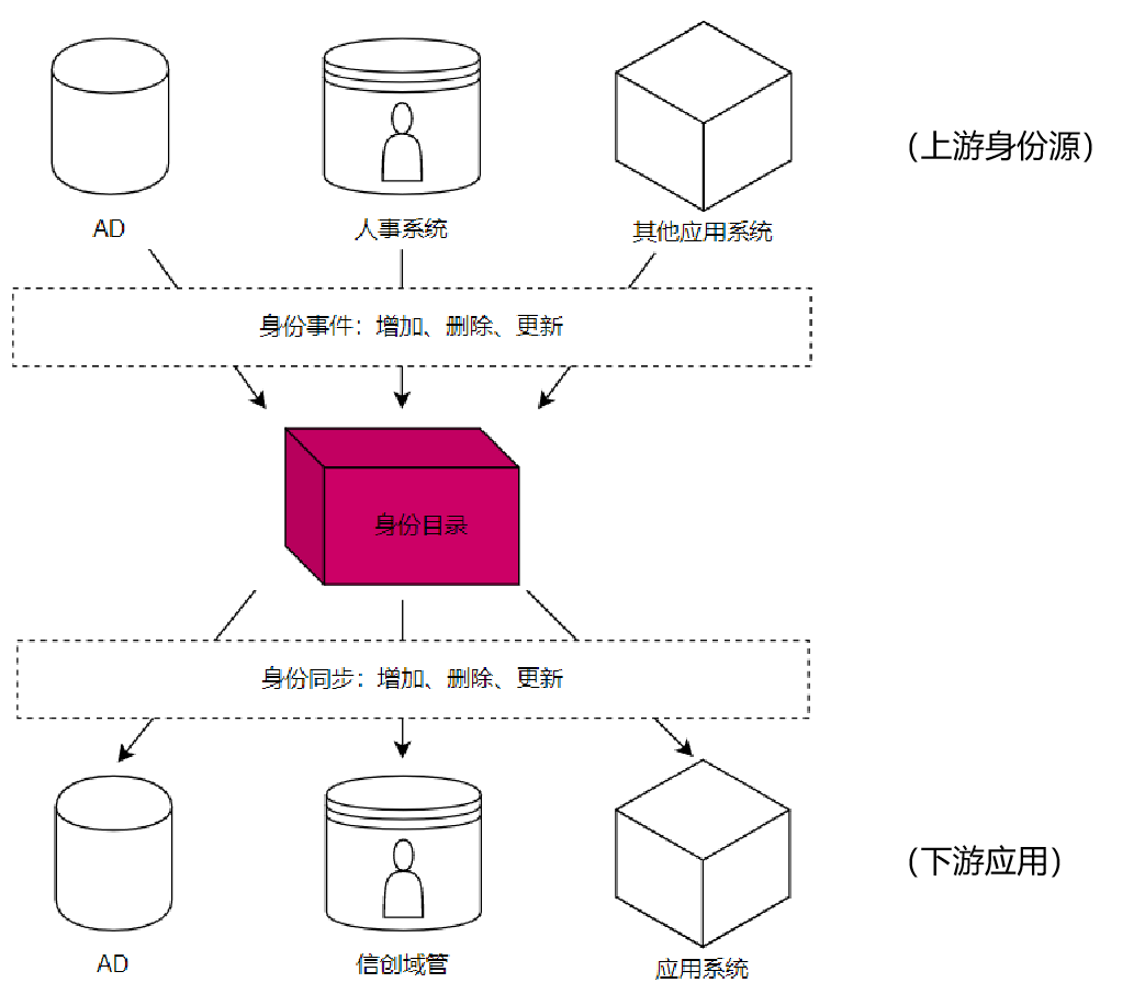 身份目录负责存储用户账号、密码、组织架构、用户组等数据,并处理身份的上下游同步。