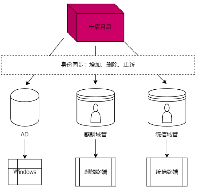 使用各平台域管平台,如Windows使用AD,麒麟使用天域,统信使用统信域管,由宁盾目录同步几种域管平台数据;